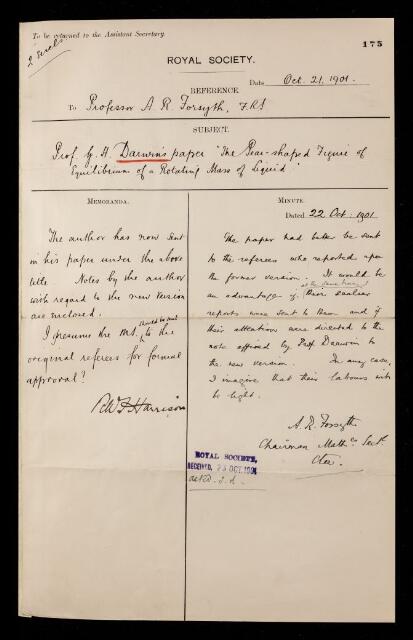 Andrew Russell Forsyth, Memoranda from Robert William Frederick Harrison, and reply from Andrew Russell Forsyth, on a paper 'The pear shaped and other figures of equilibrium of a rotating mass of liquid' by George Howard Darwin, 21 October 1901, RR/15/175, The Royal Society Archives, London, https://makingscience.royalsociety.org/items/rr_15_175/memoranda-from-robert-william-frederick-harrison-and-reply-from-andrew-russell-forsyth-on-a-paper-the-pear-shaped-and-other-figures-of-equilibrium-of-a-rotating-mass-of-liquid-by-george-howard-darwin, accessed on 18 April 2026