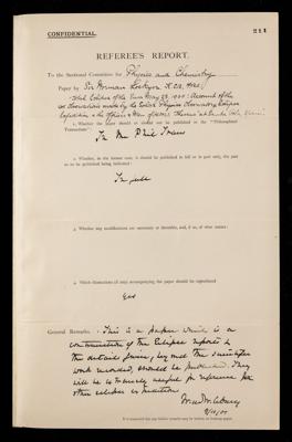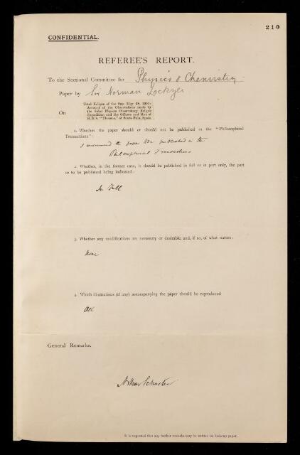 Arthur Schuster, Referee's report by Arthur Schuster, on a paper 'Total eclipse of the sun, May 28, 1900; Account of the observations made by the solar physics observatory eclipse expedition and the officers and men of H.M.S. "Theseus", at Santa Pola, Spain' by Norman Lockyer, July 1901, RR/15/210, The Royal Society Archives, London, https://makingscience.royalsociety.org/items/rr_15_210/referees-report-by-arthur-schuster-on-a-paper-total-eclipse-of-the-sun-may-28-1900-account-of-the-observations-made-by-the-solar-physics-observatory-eclipse-expedition-and-the-officers-and-men-of-hms-theseus-at-santa-pola-spain-by-norman-lockyer, accessed on 24 January 2026