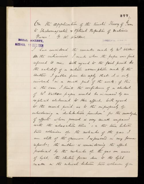 Joseph John Thomson, Second referee's report by Joseph John Thomson, on a paper 'The application of the kinetic theory of gases to to electric, magnetic & optical properties of diatomic gases' by George Walker Walker, 12 December 1901, RR/15/277, The Royal Society Archives, London, https://makingscience.royalsociety.org/items/rr_15_277/second-referees-report-by-joseph-john-thomson-on-a-paper-the-application-of-the-kinetic-theory-of-gases-to-to-electric-magnetic-optical-properties-of-diatomic-gases-by-george-walker-walker, accessed on 21 April 2026