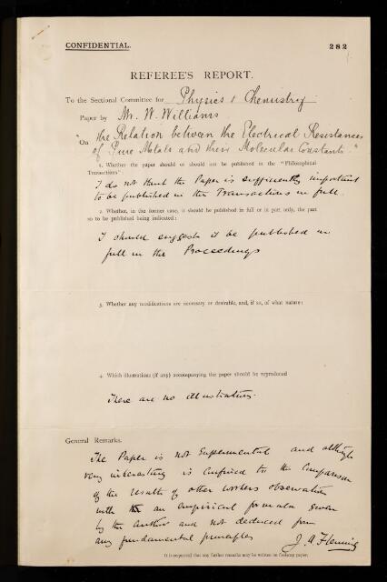 John Ambrose Fleming, Referee's report by John Ambrose Fleming, on a paper 'On a suggested relation between the refractive indices of pure metals and their molecular constants' by W Williams, 25 March 1901, RR/15/282, The Royal Society Archives, London, https://makingscience.royalsociety.org/items/rr_15_282/referees-report-by-john-ambrose-fleming-on-a-paper-on-a-suggested-relation-between-the-refractive-indices-of-pure-metals-and-their-molecular-constants-by-w-williams, accessed on 14 March 2026