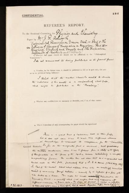 James Alfred Ewing, Referee's report by James Alfred Ewing, on a paper 'Experimental researches on drawn steel. - Part I. The influence of changes of temperature on magnetism. Part II. Resistivity, elasticity and density, and the temperature coefficients of resistivity and elasticity' by J R Ashworth, 08 February 1902, RR/15/294, The Royal Society Archives, London, https://makingscience.royalsociety.org/items/rr_15_294/referees-report-by-james-alfred-ewing-on-a-paper-experimental-researches-on-drawn-steel-part-i-the-influence-of-changes-of-temperature-on-magnetism-part-ii-resistivity-elasticity-and-density-and-the-temperature-coefficients-of-resistivity-and-elasticity-by-j-r-ashworth, accessed on 09 March 2026