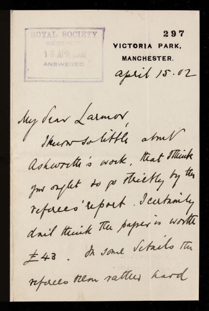 Knows so little about Ashworth's work that he thinks Larmor ought to go strictly by the referees' report. He certainly does not think the paper worth £43. In some details the referees seem 'rather hard'. The method used to measure the Young's modulus may not be good, but he understands it was the only one available with the particular form in which the specimens could be obtained. Does not know Dr Morris' work and is told it deals with a different matter. There does not seem to be much hurry about the paper and as there is a difficulty, he wonders if it would be better to let it wait until the next meeting.