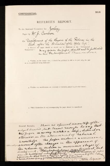 Adam Sedgwick, Referee's report by Adam Sedgwick, on a paper 'Development of the layers of the retina in the chick after the formation of the optic cup' by J Cameron, 13 March 1902, RR/15/311, The Royal Society Archives, London, https://makingscience.royalsociety.org/items/rr_15_311/referees-report-by-adam-sedgwick-on-a-paper-development-of-the-layers-of-the-retina-in-the-chick-after-the-formation-of-the-optic-cup-by-j-cameron, accessed on 12 February 2026