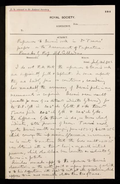 Hugh Longbourne Callendar, Second referee's report by Hugh Longbourne Callendar, on a paper 'The measurements of temperature. Parts I-III' by Morris William Travers, George Senter and Adrien Jaquerod, 04 June 1902, RR/15/394, The Royal Society Archives, London, https://makingscience.royalsociety.org/items/rr_15_394/second-referees-report-by-hugh-longbourne-callendar-on-a-paper-the-measurements-of-temperature-parts-i-iii-by-morris-william-travers-george-senter-and-adrien-jaquerod, accessed on 14 February 2026