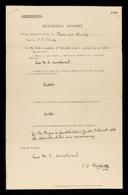 Ernest Howard Griffiths, Referee's report by Ernest Howard Griffiths, on a paper 'The determination of specific heats, especially at low temperatures' by H E Schmitz, 20 April 1903, RR/16/106, The Royal Society Archives, London, https://makingscience.royalsociety.org/items/rr_16_106/referees-report-by-ernest-howard-griffiths-on-a-paper-the-determination-of-specific-heats-especially-at-low-temperatures-by-h-e-schmitz, accessed on 08 December 2025