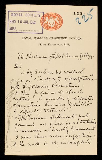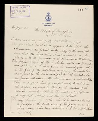 John Bretland Farmer, Referee's report by John Bretland Farmer, on a paper 'The oocyte of Tomopteris' by Mr Wallace, July 1903, RR/16/132, The Royal Society Archives, London, https://makingscience.royalsociety.org/items/rr_16_132/referees-report-by-john-bretland-farmer-on-a-paper-the-oocyte-of-tomopteris-by-mr-wallace, accessed on 17 March 2026
