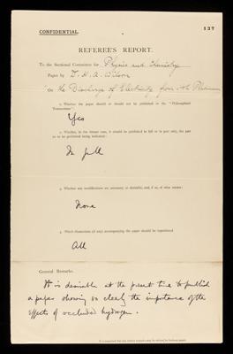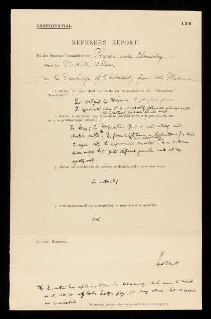Joseph Larmor, Referee's report by Joseph Larmor, on a paper 'On the discharge of electricity from hot Platinum' by Harold Albert Wilson, June 1903, RR/16/136, The Royal Society Archives, London, https://makingscience.royalsociety.org/items/rr_16_136/referees-report-by-joseph-larmor-on-a-paper-on-the-discharge-of-electricity-from-hot-platinum-by-harold-albert-wilson, accessed on 10 November 2025
