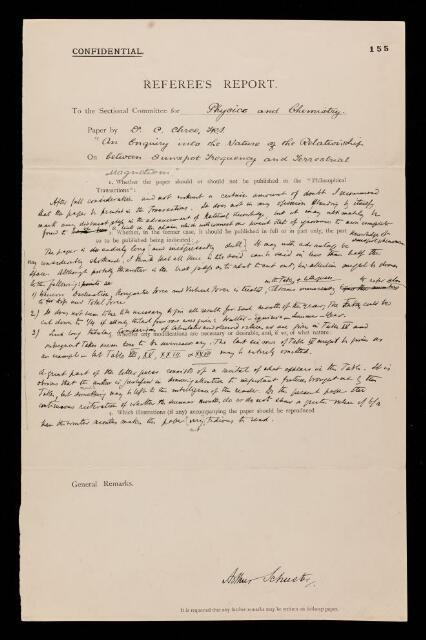 Arthur Schuster, Referee's report by Arthur Schuster, on a paper 'An enquiry into the nature of the relationship between sunspot frequency and terrestrial magnetism' by Charles Chree, March 1904, RR/16/155, The Royal Society Archives, London, https://makingscience.royalsociety.org/items/rr_16_155/referees-report-by-arthur-schuster-on-a-paper-an-enquiry-into-the-nature-of-the-relationship-between-sunspot-frequency-and-terrestrial-magnetism-by-charles-chree, accessed on 17 March 2026