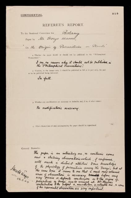 Harold William Taylor Wager, Referee's report by Harold William Taylor Wager, on a paper 'The origin of parasitism in plants' by George Massee, 23 January 1904, RR/16/210, The Royal Society Archives, London, https://makingscience.royalsociety.org/items/rr_16_210/referees-report-by-harold-william-taylor-wager-on-a-paper-the-origin-of-parasitism-in-plants-by-george-massee, accessed on 16 January 2026