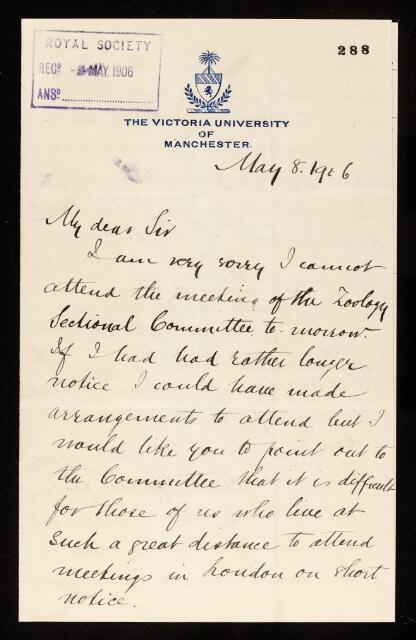 Is sorry he cannot attend the meeting of the Zoology Sectional Committee the next day. If he had received more notice he could have made arrangements to attend and would like his correspondent to point out to the Committee that it is difficult for those living at distance to attend meetings in London on short notice.