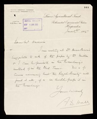 Robert Warington, Referee's report by Robert Warington, on a paper 'The effect of plant growth & of manures upon the soil: the retention of bases by the soil' by A D Hall and N H J Miller, 28 April 1905, RR/16/318, The Royal Society Archives, London, https://makingscience.royalsociety.org/items/rr_16_318/referees-report-by-robert-warington-on-a-paper-the-effect-of-plant-growth-of-manures-upon-the-soil-the-retention-of-bases-by-the-soil-by-a-d-hall-and-n-h-j-miller, accessed on 08 February 2026