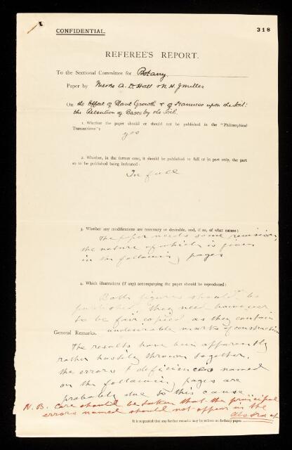 Referee's report by Sydney Howard Vines, on a paper 'The effect of plant growth & of manures upon the soil: the retention of bases by the soil' by A D Hall and N H J Muller
