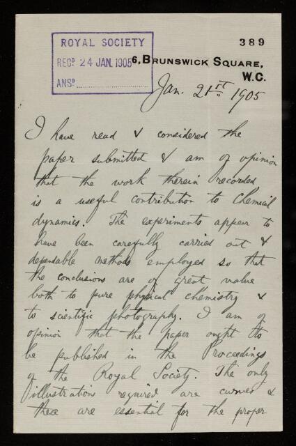 Raphael Meldola, Referee's report by Raphael Meldola, on a paper 'The theory of the photographic process: on the chemical dynamics of development' by S E Sheppard and C E K Mees, 21 January 1905, RR/16/389, The Royal Society Archives, London, https://makingscience.royalsociety.org/items/rr_16_389/referees-report-by-raphael-meldola-on-a-paper-the-theory-of-the-photographic-process-on-the-chemical-dynamics-of-development-by-s-e-sheppard-and-c-e-k-mees, accessed on 17 January 2026