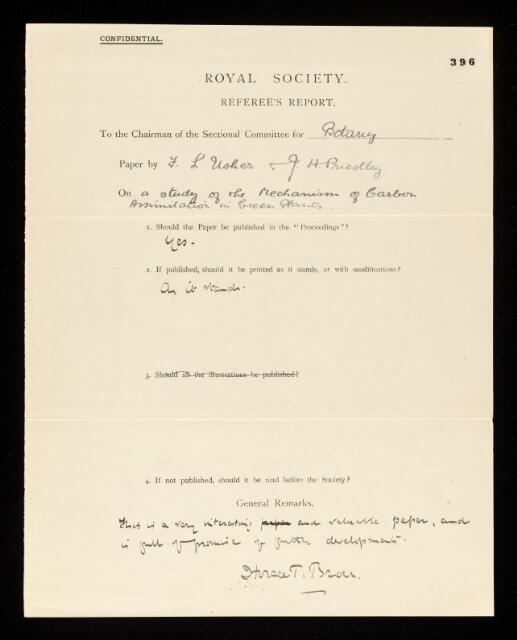 Horace Tabberer Brown, Referee's report by Horace Tabberer Brown, on a paper 'A study of the mechanism of carbon assimilation in green plants' by Francis L Usher and J H Priestley, January 1906, RR/16/396, The Royal Society Archives, London, https://makingscience.royalsociety.org/items/rr_16_396/referees-report-by-horace-tabberer-brown-on-a-paper-a-study-of-the-mechanism-of-carbon-assimilation-in-green-plants-by-francis-l-usher-and-j-h-priestley, accessed on 06 December 2025