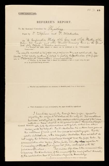 Charles Scott Sherrington, Referee's report by Charles Scott Sherrington, on a paper 'A comparative study of the grey and white matter of the motor-cell groups; and the spinal-accessory nerve in the spinal cord of the porpoise, (Phocoena communis)' by D Hepburn and D Waterston, July 1903, RR/16/65, The Royal Society Archives, London, https://makingscience.royalsociety.org/items/rr_16_65/referees-report-by-charles-scott-sherrington-on-a-paper-a-comparative-study-of-the-grey-and-white-matter-of-the-motor-cell-groups-and-the-spinal-accessory-nerve-in-the-spinal-cord-of-the-porpoise-phocoena-communis-by-d-hepburn-and-d-waterston, accessed on 15 February 2026