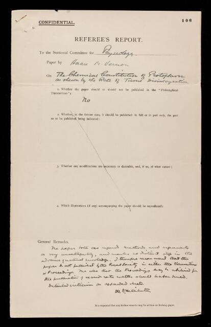 William Dobinson Halliburton, Referee's report by William Dobinson Halliburton, on a paper 'The chemical constitution of protoplasm as shown by the rate of tissue disintegration' by Horace M Vernon, February 1906, RR/17/106, The Royal Society Archives, London, https://makingscience.royalsociety.org/items/rr_17_106/referees-report-by-william-dobinson-halliburton-on-a-paper-the-chemical-constitution-of-protoplasm-as-shown-by-the-rate-of-tissue-disintegration-by-horace-m-vernon, accessed on 13 April 2026