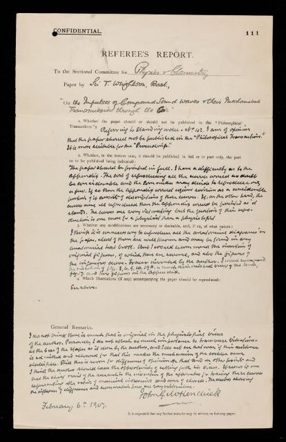 John Gray McKendrick, Referee's report by John Gray McKendrick, on a paper 'The impulses of compound waves and their mechanical transmission through the ear' by Sir Thomas Wrightson, 06 February 1907, RR/17/111, The Royal Society Archives, London, https://makingscience.royalsociety.org/items/rr_17_111/referees-report-by-john-gray-mckendrick-on-a-paper-the-impulses-of-compound-waves-and-their-mechanical-transmission-through-the-ear-by-sir-thomas-wrightson, accessed on 12 April 2026