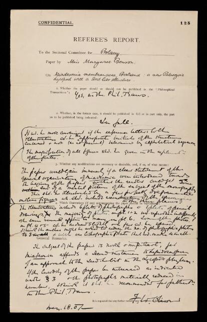 Francis Wall Oliver, Referee's report by Francis Wall Oliver, on a paper 'Miadesmia membranacea, Bertand; a new Palœozoic Lycopod with a seed-like structure' by Margaret Benson, 18 May 1907, RR/17/125, The Royal Society Archives, London, https://makingscience.royalsociety.org/items/rr_17_125/referees-report-by-francis-wall-oliver-on-a-paper-miadesmia-membranacea-bertand-a-new-palœozoic-lycopod-with-a-seed-like-structure-by-margaret-benson, accessed on 16 February 2026
