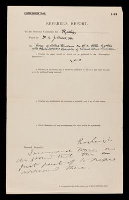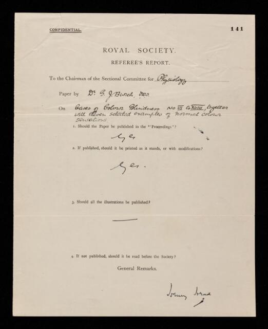 Henry Head, Referee's report by Henry Head, on a paper 'Cases of colour-blindness, No. VI to No. XVIII, together with eleven selected examples of normal colour sensations' by George James Burch, June 1907, RR/17/141, The Royal Society Archives, London, https://makingscience.royalsociety.org/items/rr_17_141/referees-report-by-henry-head-on-a-paper-cases-of-colour-blindness-no-vi-to-no-xviii-together-with-eleven-selected-examples-of-normal-colour-sensations-by-george-james-burch, accessed on 13 March 2026
