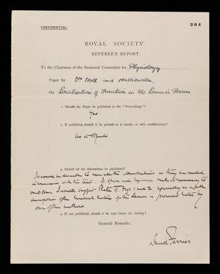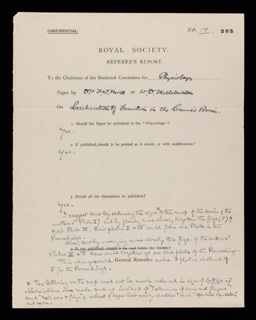 Charles Scott Sherrington, Referee's report by Charles Scott Sherrington, on a paper 'Localisation of function in the lemur’s brain' by Frederick Walker Mott and William Dobinson Halliburton, December 1907, RR/17/205, The Royal Society Archives, London, https://makingscience.royalsociety.org/items/rr_17_205/referees-report-by-charles-scott-sherrington-on-a-paper-localisation-of-function-in-the-lemurs-brain-by-frederick-walker-mott-and-william-dobinson-halliburton, accessed on 13 February 2026
