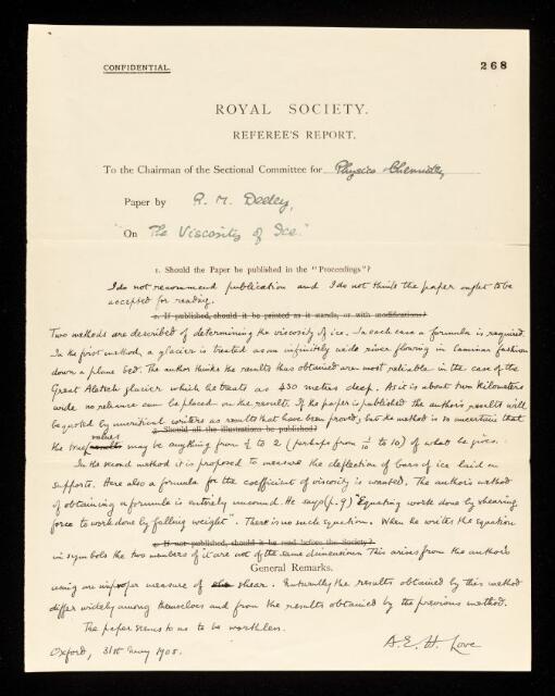 Augustus Edward Hough Love, Referee's report by Augustus Edward Hough Love, on a paper 'The viscosity of ice' by R M Deeley, 31 May 1908, RR/17/268, The Royal Society Archives, London, https://makingscience.royalsociety.org/items/rr_17_268/referees-report-by-augustus-edward-hough-love-on-a-paper-the-viscosity-of-ice-by-r-m-deeley, accessed on 19 November 2025