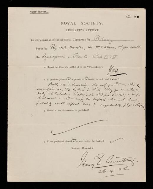 Henry Edward Armstrong, Referee's report by Henry Edward Armstrong, on a paper 'Cyanogenesis in plants. Part IV & V' by Wyndham Rowland Dunstan, Thomas A Henry and S J M Auld, 26 April 1906, RR/17/29, The Royal Society Archives, London, https://makingscience.royalsociety.org/items/rr_17_29/referees-report-by-henry-edward-armstrong-on-a-paper-cyanogenesis-in-plants-part-iv-v-by-wyndham-rowland-dunstan-thomas-a-henry-and-s-j-m-auld, accessed on 07 November 2025