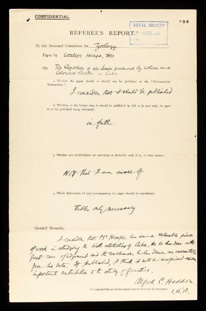 Alfred Cort Haddon, Referee's report by Alfred Cort Haddon, on a paper 'The proportion of the sexes produced by whites and 'coloured people' in Cuba' by Walter Heape, 01 November 1908, RR/17/296, The Royal Society Archives, London, https://makingscience.royalsociety.org/items/rr_17_296/referees-report-by-alfred-cort-haddon-on-a-paper-the-proportion-of-the-sexes-produced-by-whites-and-coloured-people-in-cuba-by-walter-heape, accessed on 16 March 2026
