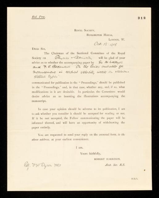 Frank Watson Dyson, Referee's report by Frank Watson Dyson, on a paper 'On the lines suitable for measurement in radial velocity on various stellar types' by Joseph Norman Lockyer and F E Baxandall, October 1908, RR/17/312, The Royal Society Archives, London, https://makingscience.royalsociety.org/items/rr_17_312/referees-report-by-frank-watson-dyson-on-a-paper-on-the-lines-suitable-for-measurement-in-radial-velocity-on-various-stellar-types-by-joseph-norman-lockyer-and-f-e-baxandall, accessed on 17 February 2026
