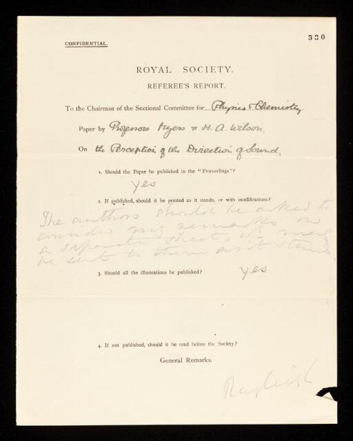 Robert John Strutt, Referee's report by Robert John Strutt, Lord Rayleigh on a paper 'The perception of the direction of sound' by Charles Samuel Myers and Harold Albert Wilson, January 1908, RR/17/330, The Royal Society Archives, London, https://makingscience.royalsociety.org/items/rr_17_330/referees-report-by-robert-john-strutt-lord-rayleigh-on-a-paper-the-perception-of-the-direction-of-sound-by-charles-samuel-myers-and-harold-albert-wilson, accessed on 16 April 2026