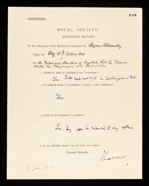 Joseph Larmor, Referee's report by Joseph Larmor, on a paper 'The intimate structure of crystals part VI' by William Johnson Sollas, 11 January 1908, RR/17/349, The Royal Society Archives, London, https://makingscience.royalsociety.org/items/rr_17_349/referees-report-by-joseph-larmor-on-a-paper-the-intimate-structure-of-crystals-part-vi-by-william-johnson-sollas, accessed on 09 February 2026
