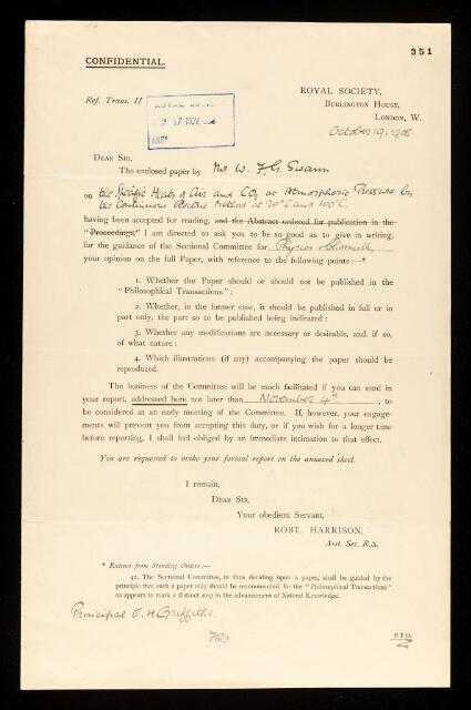 Ernest Howard Griffiths, Referee's report by Ernest Howard Griffiths, on a paper 'The specific heats of air and carbon dioxide at atmospheric pressure by the continuous electric method at 20 degrees celsius and 100 degrees celsius' by W F G Swann, 19 October 1908, RR/17/351, The Royal Society Archives, London, https://makingscience.royalsociety.org/items/rr_17_351/referees-report-by-ernest-howard-griffiths-on-a-paper-the-specific-heats-of-air-and-carbon-dioxide-at-atmospheric-pressure-by-the-continuous-electric-method-at-20-degrees-celsius-and-100-degrees-celsius-by-w-f-g-swann, accessed on 08 February 2026