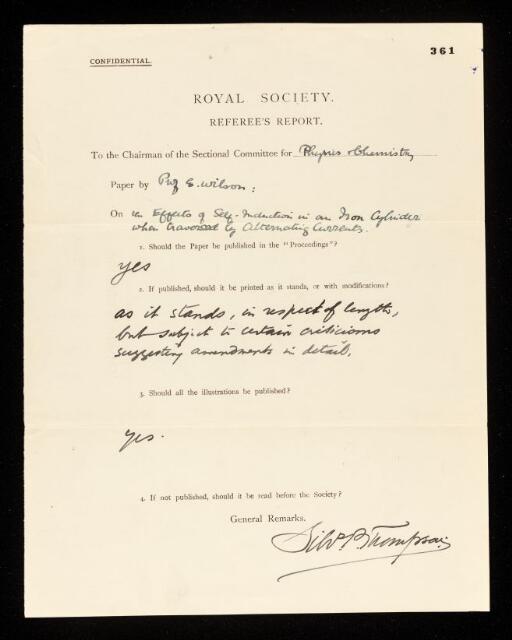 Silvanus Phillips Thompson, Referee's report by Silvanus Phillips Thompson, on a paper 'The effects of self-induction in an iron cylinder when traversed by alternating currents' by E Wilson, January 1908, RR/17/361, The Royal Society Archives, London, https://makingscience.royalsociety.org/items/rr_17_361/referees-report-by-silvanus-phillips-thompson-on-a-paper-the-effects-of-self-induction-in-an-iron-cylinder-when-traversed-by-alternating-currents-by-e-wilson, accessed on 13 February 2026