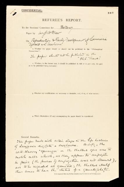 Francis Wall Oliver, Referee's report by Francis Wall Oliver, on a paper 'Reproduction and early development of laminaria digitata and L. saccharina' by G H Drew, April 1909, RR/17/387, The Royal Society Archives, London, https://makingscience.royalsociety.org/items/rr_17_387/referees-report-by-francis-wall-oliver-on-a-paper-reproduction-and-early-development-of-laminaria-digitata-and-l-saccharina-by-g-h-drew, accessed on 08 December 2025