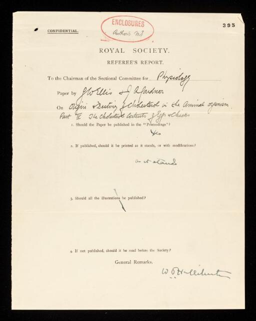 William Dobinson Halliburton, Referee's report by William Dobinson Halliburton, on a paper 'The origin and destiny of cholesterol in the animal organism. Part IV. — The cholesterol contents of eggs and chicks' by G W Ellis and J A Gardner, January 1909, RR/17/395, The Royal Society Archives, London, https://makingscience.royalsociety.org/items/rr_17_395/referees-report-by-william-dobinson-halliburton-on-a-paper-the-origin-and-destiny-of-cholesterol-in-the-animal-organism-part-iv-the-cholesterol-contents-of-eggs-and-chicks-by-g-w-ellis-and-j-a-gardner, accessed on 10 November 2025