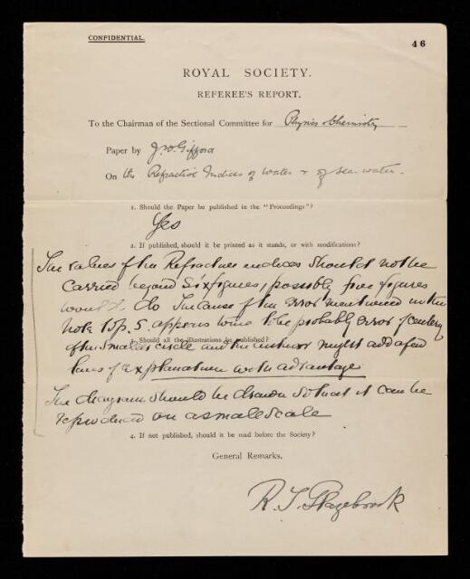 Richard Tetley Glazebrook, Referee's report by Richard Tetley Glazebrook, on a paper 'The refractive indices of water and of sea-water' by J W Gifford, 1906, RR/17/46, The Royal Society Archives, London, https://makingscience.royalsociety.org/items/rr_17_46/referees-report-by-richard-tetley-glazebrook-on-a-paper-the-refractive-indices-of-water-and-of-sea-water-by-j-w-gifford, accessed on 13 December 2025