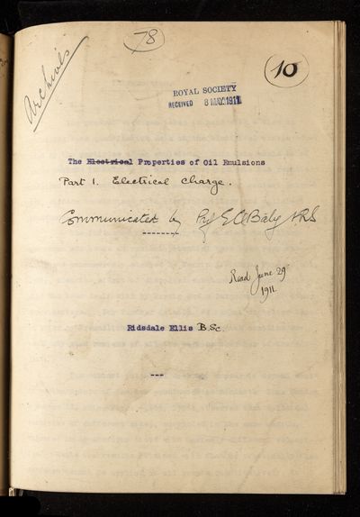 Unpublished paper, 'The properties of oil emulsions. Part I: Electrical charge' by Ridsdale Ellis