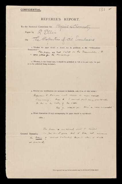 William Bate Hardy, Referee's report and letter from William Bate Hardy, on a paper 'The properties of oil emulsions' by R Ellis, 28 May 1911, RR/18/131, The Royal Society Archives, London, https://makingscience.royalsociety.org/items/rr_18_131/referees-report-and-letter-from-william-bate-hardy-on-a-paper-the-properties-of-oil-emulsions-by-r-ellis, accessed on 14 December 2025