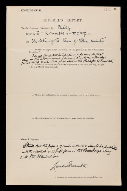 Thomas Lauder Brunton, Referee's report by Thomas Lauder Brunton, on a paper 'The action of the venom of Echis carinatus' by Thomas Richard Fraser and James A Gunn, February 1911, RR/18/134, The Royal Society Archives, London, https://makingscience.royalsociety.org/items/rr_18_134/referees-report-by-thomas-lauder-brunton-on-a-paper-the-action-of-the-venom-of-echis-carinatus-by-thomas-richard-fraser-and-james-a-gunn, accessed on 09 November 2025