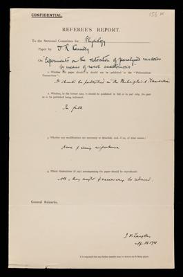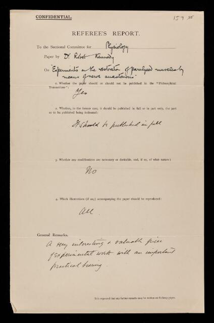 Frederick Walker Mott, Referee's report by Frederick Walker Mott, on a paper 'Experiments on the restoration of paralysed muscles by means of nerve anastomosis. Part I - substitutes for the facial nerve' by Robery Kennedy, May 1911, RR/18/157, The Royal Society Archives, London, https://makingscience.royalsociety.org/items/rr_18_157/referees-report-by-frederick-walker-mott-on-a-paper-experiments-on-the-restoration-of-paralysed-muscles-by-means-of-nerve-anastomosis-part-i-substitutes-for-the-facial-nerve-by-robery-kennedy, accessed on 06 March 2026
