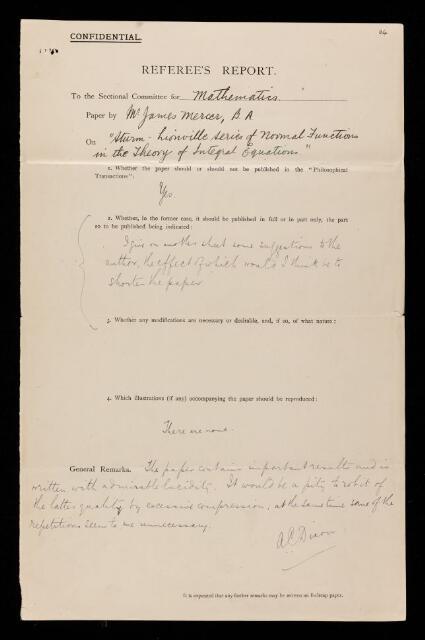 Alfred Cardew Dixon, Referee's report by Alfred Cardew Dixon, on a paper 'Sturm-Liouville series of normal functions in the theory of integral equations' by James Mercer, May 1910, RR/18/64, The Royal Society Archives, London, https://makingscience.royalsociety.org/items/rr_18_64/referees-report-by-alfred-cardew-dixon-on-a-paper-sturm-liouville-series-of-normal-functions-in-the-theory-of-integral-equations-by-james-mercer, accessed on 06 November 2025