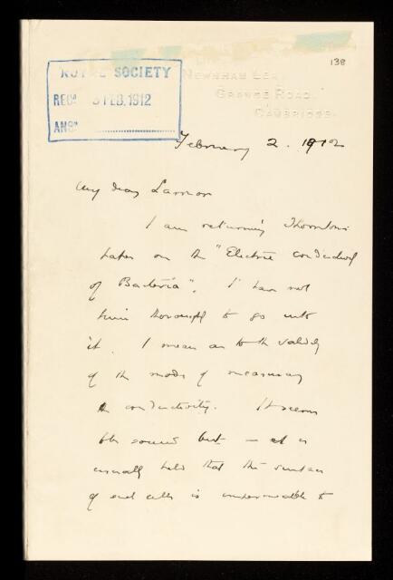 William Bate Hardy, Letter from William Bate Hardy, to Joseph Larmor, regarding a paper 'The chemical action of Bacillus cloacae (Jordan) on citric and malic acids in the presence and absence of oxygen' by James Thompson, 02 February 1912, RR/19/138, The Royal Society Archives, London, https://makingscience.royalsociety.org/items/rr_19_138/letter-from-william-bate-hardy-to-joseph-larmor-regarding-a-paper-the-chemical-action-of-bacillus-cloacae-jordan-on-citric-and-malic-acids-in-the-presence-and-absence-of-oxygen-by-james-thompson, accessed on 19 January 2026