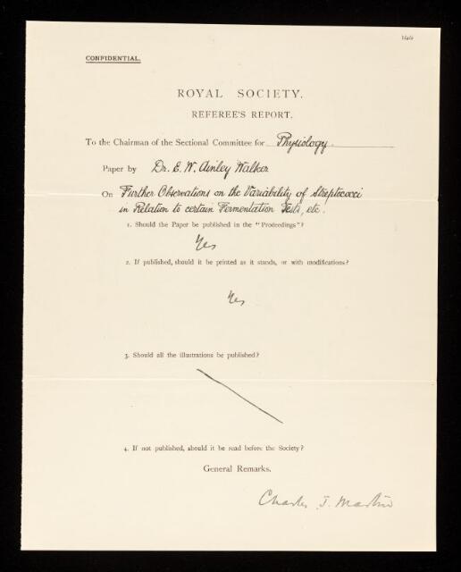 Charles James Martin, Referee's report by Charles James Martin, on a paper 'Further observations on the variability of streptococci in relation to certain fermentation tests, together with some considerations bearing on its possible meaning' by E W Ainley Walker, June 1912, RR/19/144, The Royal Society Archives, London, https://makingscience.royalsociety.org/items/rr_19_144/referees-report-by-charles-james-martin-on-a-paper-further-observations-on-the-variability-of-streptococci-in-relation-to-certain-fermentation-tests-together-with-some-considerations-bearing-on-its-possible-meaning-by-e-w-ainley-walker, accessed on 12 November 2025