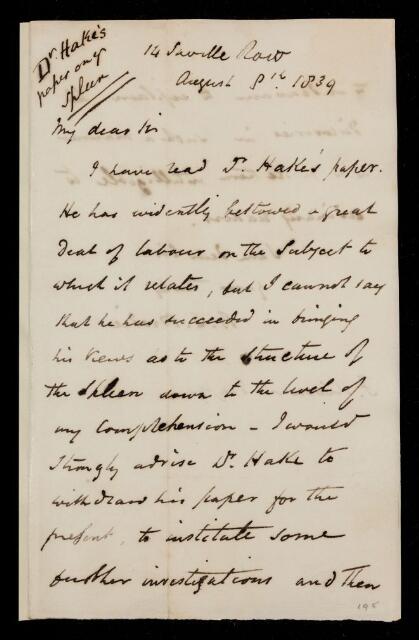 Benjamin Collins Brodie, Referee's report by Benjamin Collins Brodie, on a paper 'On the structure and functions of the spleen' by Thomas Gordon Hake, 09 August 1839, RR/1/85, The Royal Society Archives, London, https://makingscience.royalsociety.org/items/rr_1_85/referees-report-by-benjamin-collins-brodie-on-a-paper-on-the-structure-and-functions-of-the-spleen-by-thomas-gordon-hake, accessed on 13 January 2026