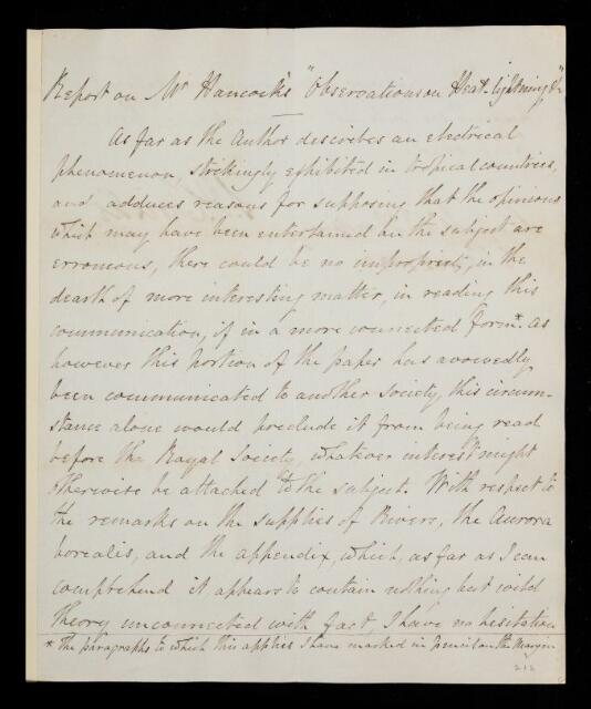 Referee's report by Samuel Hunter Christie, on a paper 'Observations on heat lightening' by Hancock