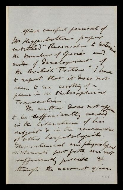 Referee's report by Edward Forbes, on a paper 'Researches to determine the number of species and the mode of development of the British Triton' by Higgenbottom