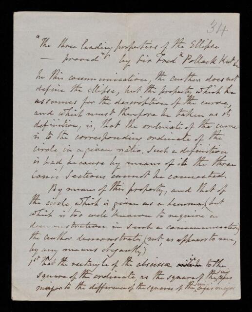 Samuel Hunter Christie, Referee's report by Samuel Hunter Christie, on a paper 'A method of proving the three leading properties of the ellipse and the hyperbola from a well-known property of the circle' by Jonathan Frederick Pollock, 1843, RR/1bis/34, The Royal Society Archives, London, https://makingscience.royalsociety.org/items/rr_1bis_34/referees-report-by-samuel-hunter-christie-on-a-paper-a-method-of-proving-the-three-leading-properties-of-the-ellipse-and-the-hyperbola-from-a-well-known-property-of-the-circle-by-jonathan-frederick-pollock, accessed on 23 January 2026
