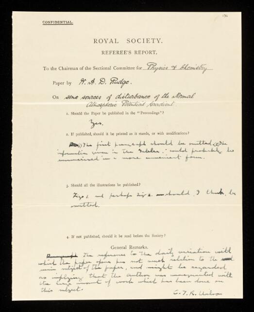 Charles Thomson Rees Wilson, Referee's report by Charles Thomson Rees Wilson, on a paper 'On some sources of disturbance of the normal atmospheric potential gradient' by W A Douglas Rudge, 1914, RR/21/136, The Royal Society Archives, London, https://makingscience.royalsociety.org/items/rr_21_136/referees-report-by-charles-thomson-rees-wilson-on-a-paper-on-some-sources-of-disturbance-of-the-normal-atmospheric-potential-gradient-by-w-a-douglas-rudge, accessed on 08 February 2026