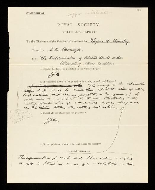 Bertram Hopkinson, Referee's report by Bertram Hopkinson, on a paper 'The determination of fatigue limits under alternating stress conditions' by C E Stromeyer, May 1914, RR/21/143, The Royal Society Archives, London, https://makingscience.royalsociety.org/items/rr_21_143/referees-report-by-bertram-hopkinson-on-a-paper-the-determination-of-fatigue-limits-under-alternating-stress-conditions-by-c-e-stromeyer, accessed on 22 April 2026