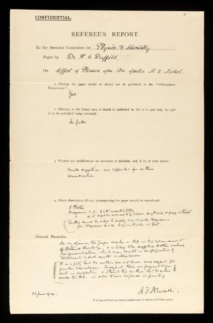 Hugh Frank Newall, Referee's report by Hugh Frank Newall, on a paper 'The effect of pressure upon arc spectra No.5 Nickel' by W Geoffrey Duffield, 22 June 1914, RR/21/61, The Royal Society Archives, London, https://makingscience.royalsociety.org/items/rr_21_61/referees-report-by-hugh-frank-newall-on-a-paper-the-effect-of-pressure-upon-arc-spectra-no5-nickel-by-w-geoffrey-duffield, accessed on 10 February 2026