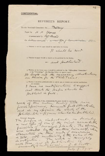 Dukinfield Henry Scott, Referee's report by Dukinfield Henry Scott, on a paper 'On williamsoniella, a new type of bennettitalean flower' by Hugh Hamshaw Thomas, 09 July 1915, RR/22/112, The Royal Society Archives, London, https://makingscience.royalsociety.org/items/rr_22_112/referees-report-by-dukinfield-henry-scott-on-a-paper-on-williamsoniella-a-new-type-of-bennettitalean-flower-by-hugh-hamshaw-thomas, accessed on 14 April 2026